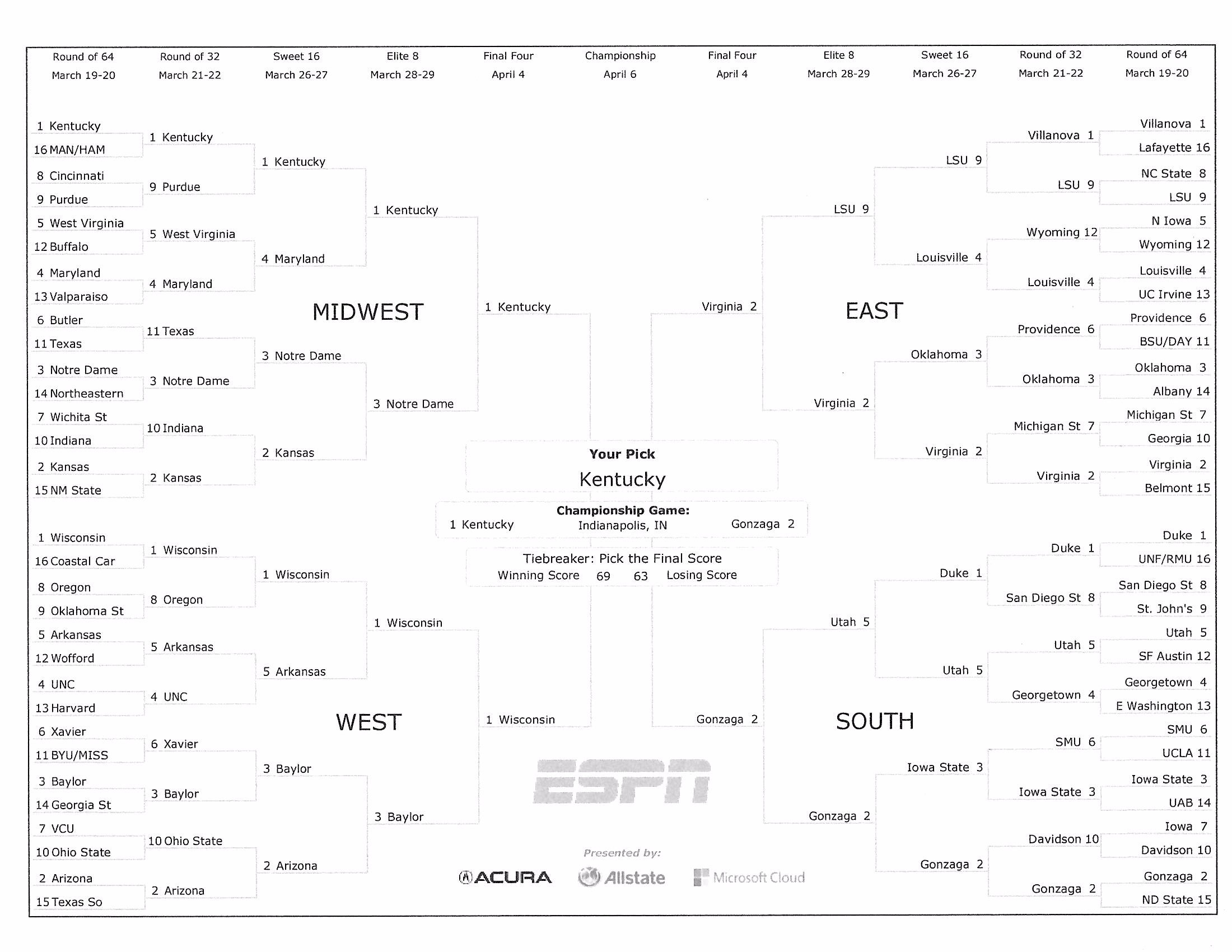 I have the 1 seed Kentucky defeating 3 Notre Dame in the regional final and making it to the Final Four.